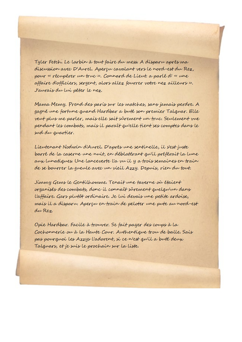 Marcus vous a supplié de l'aider à enquêter sur les combats clandestins et leur réelle motivation, ce que vous accepté. Il vous a transmis une liste de personnes qu'il soupçonne d'être liés à l'affaire (image ci-contre). Vous vous êtes donc lancés sur ces différentes pistes.