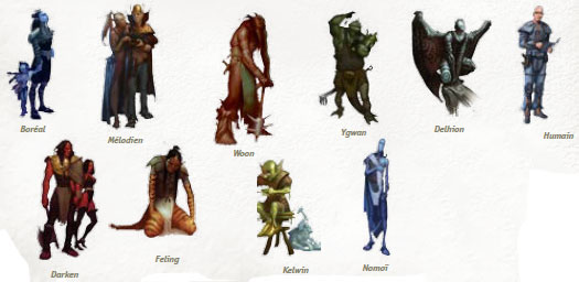 Dix Races intelligentes peuplent le monde de Shaan. Les Boréals, grands voyageurs aux sens aiguisés. Les Darkens, géants rouges à l’âme guerrière. Les Delhions, hommes-oiseaux sans visage aux tatouages vivants. Les Kelwins, sortes de gnomes à l’ingéniosité révolutionnaire. Les Felings, hommeschats à la sagesse apaisante. Les Nomoïs, magiciens hermaphrodites très rigoureux. Les Mélodiens, artistes et maîtres de la séduction. Les Ygwans, hommeslézards au savoir ancestral. Les Woons, colosses poilus en transe avec les forces élémentaires. Les Humains, échoués sur Héos, bardés de leur technologie mais inadaptés à l’environnement.