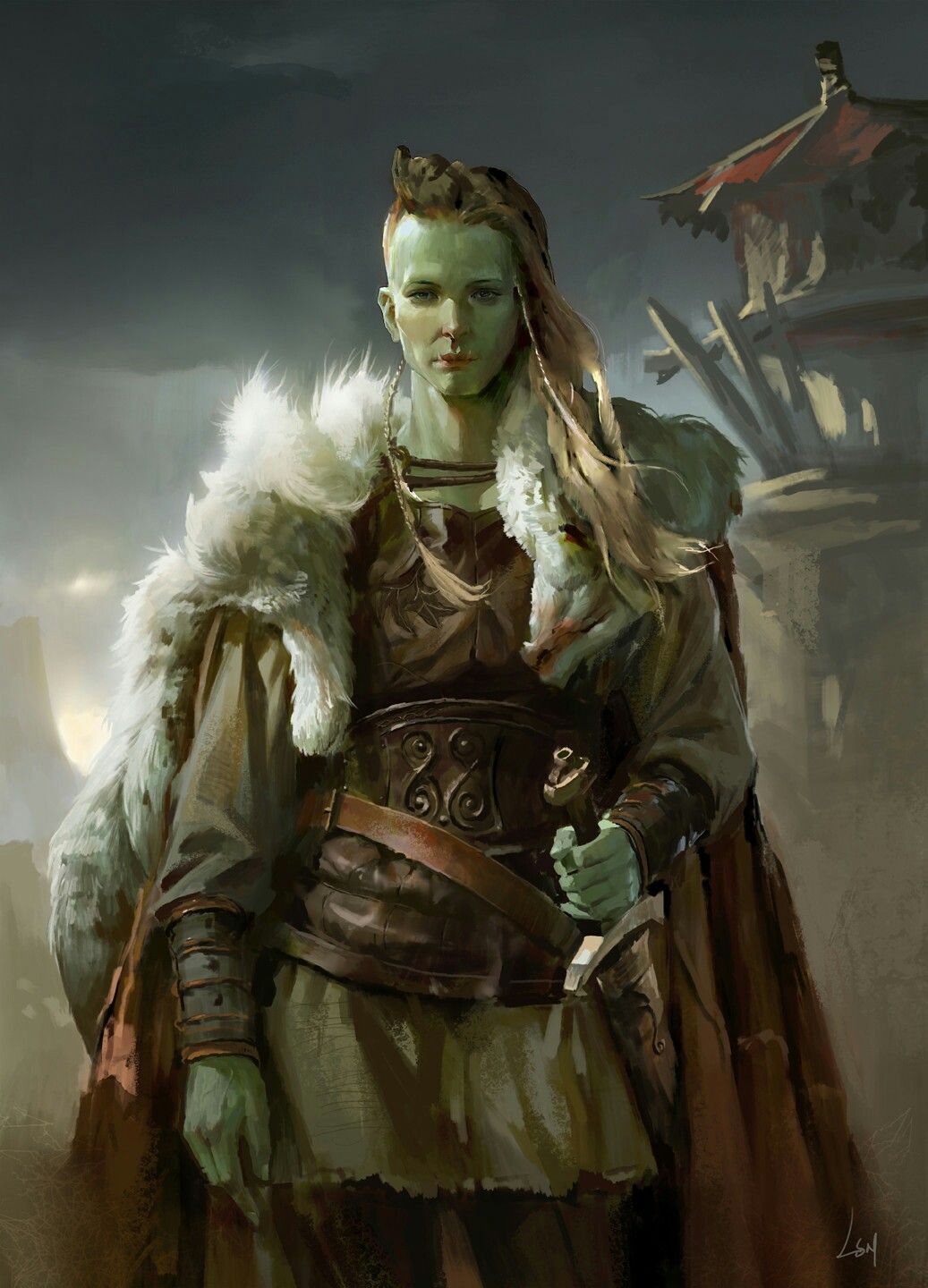 Elle porte aussi une cape étrange avec du crin de griffon.