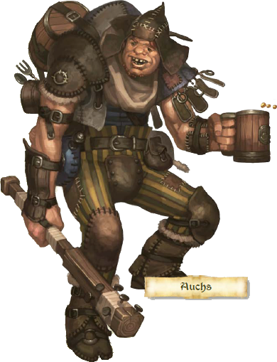 Illettré, il ne sait écrire que son nom… et encore, pas vraiment puisque Dovan a pris un plaisir pervers à lui apprendre que « Auchs » s’écrivait « Aurochs. » Cela fait six mois qu’il voyage avec Dovan, depuis que ce dernier l’a sauvé alors qu’il allait se faire tuer pour avoir déclenché une bagarre mortelle sur une place de marché de Laguénie. Il ne s’éloigne jamais beaucoup de Dovan…