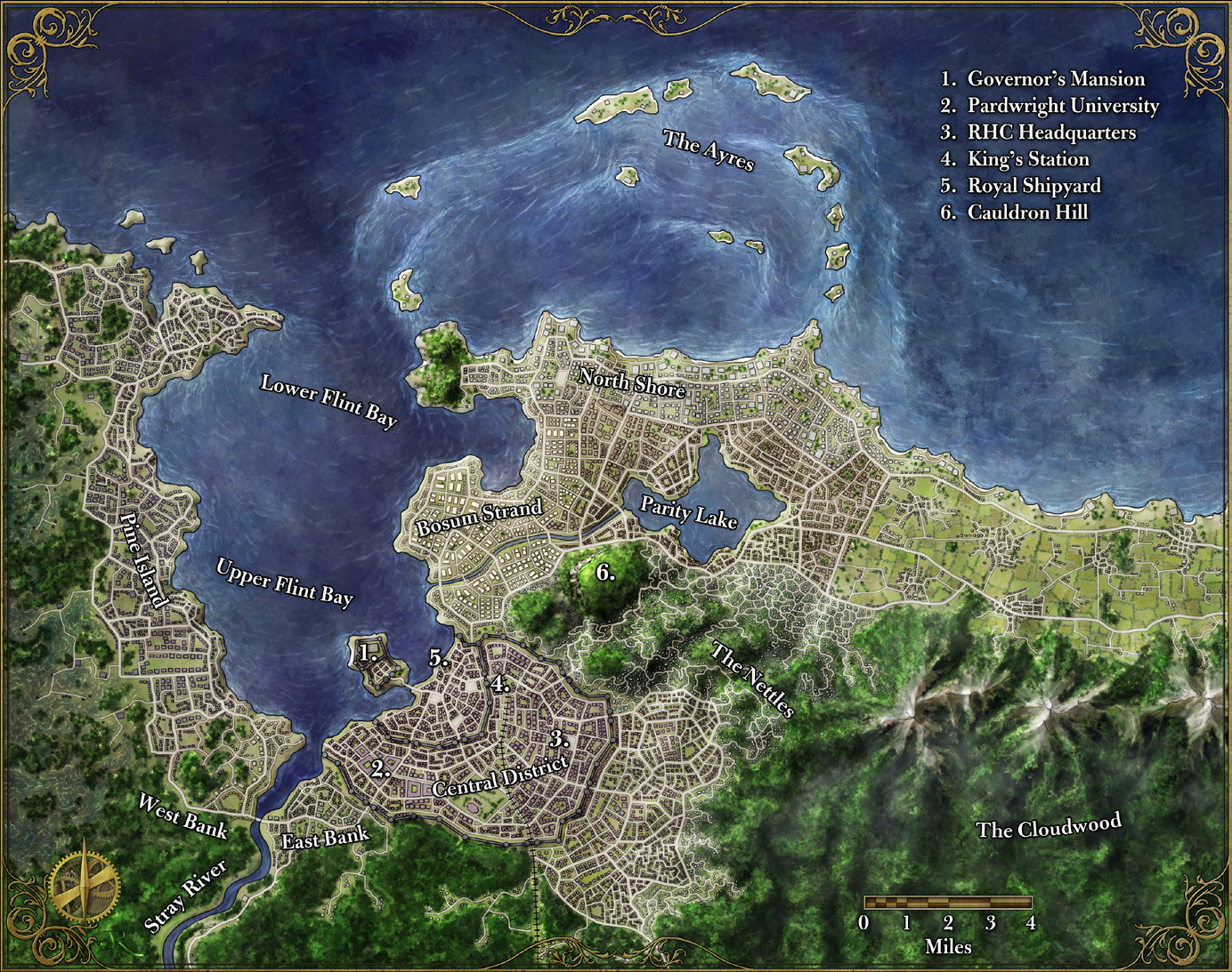 Flint’s oldest surviving building is the Navras Opera House in the central district. Navras, an eladrin who fled Elfaivar after the Great Malice, designed the opera house and laid the cornerstone with a brick he had brought from his homeland. He spent nearly two hundred years personally overseeing its construction, and was aided by no less than eight Risuri kings. When he completed the building, incongruously huge for what was at the time just a small river fort city, Navras gave the first performance by sing- ing the dirge of Vekesh. As the audience cheered and wept at his performance, he walked off the stage and disappeared forever. The acoustic design of the performance hall somehow captures magical power from song, or from the emotional reactions of the audi- ence. Impresarios who coordinate performance almost always hire spellcasting bards to harness this energy and craft a magic item as a me- mento of the show. In the three hundred years since the Navras Opera House opened, most of these items have found their ways into private collections, but a rare few have become famous, such as the Hurricane Violin, which commemo- rated the Fable of Seaquen and later banished a sea monster that threatened Flint Harbor in 417 a.o.v.